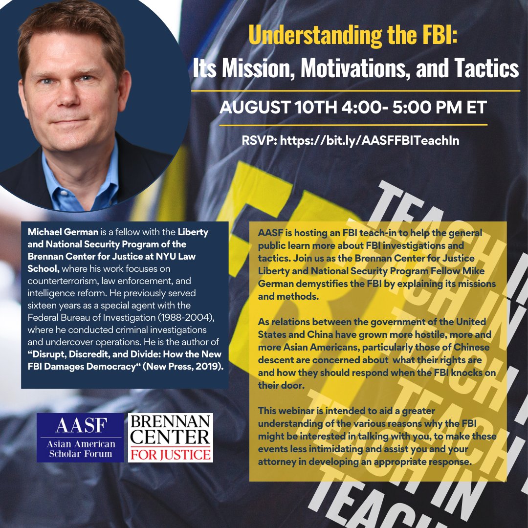 The Asian American Scholar Forum (aasforum.org) is hosting a FBI teach-in to help the general public learn more about FBI investigations and tactics. Join us as the Brennan Center for Justice Liberty and National Security Program Fellow Mike German demystifies the FBI by explaining its missions and methods.
